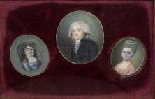 Drie miniatuurportretten in één lijst: centraal: Jean François Tourcaty (1761-?), man met gepoederde pruik, l.o. gesigneerd en gedateerd 1785; links: vrouw op octagonale drager, rechts: vrouw met opgestoken haar en bloemenkrans, afmetingen lijst: 14,5 × 18,5 cm