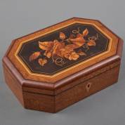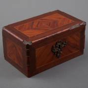Plataangefineerd kistje met bloemmarqueterie op het deksel, binnenin gemonogrammeerd MB, 7,3 × 24 × 17 cm