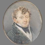 Miniatuurportret: man met krullend haar en lange bakkebaarden, in groen/blauwe jas, wit vest met hoge kraag en een donkere halsdoek, eerste helft 19e eeuw, 5,7 × 4,7 cm