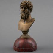 Kleine bronzen buste: classicistische man met baard, op rood natuurstenen basementje, 19 × Ø 9,5 cm