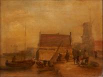 Hollandse School: figuren op de kade met molen op de achtergrond, olieverf op paneel, r.o. onduidelijk gesigneerd, 17 × 12,5 cm