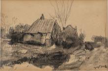 Hollandse School: boerderijtje, krijt- en inkttekening, r.o. onduidelijk gesigneerd, 8 × 12 cm
