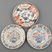 Paar Japans porseleinen Imari borden met bloemenvaasdecor, 18e eeuw -chips, haarlijn-, Ø 22,5 cm, daarbij: Japans Imari diep bord -decor sleets-, 24,5 cm
