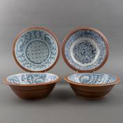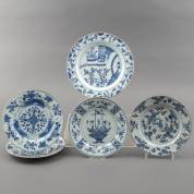 Vier Chinees porseleinen beslagkommen met diverse blauw-witte decors en capucijner rand, bestemd voor de Oosterse markt, 19e eeuw -kleine defecten-, 9 × 28 cm