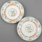 Paar Chinees porseleinen Imari verte diepe borden, 18e eeuw -defecten-, Ø 22,5 cm