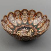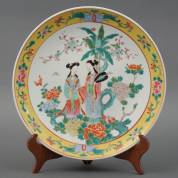 Japans porseleinen famille rose schotel, het decor met twee vrouwen in een tuin, 20e eeuw, Ø 36,5 cm -chipje-