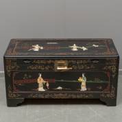 Chinese zwartlak kist met decor van figuren in tuin vervaardigd van parelmoer en natuursteen, 20e eeuw -één figuur defect, gebruikssporen-, 43 × 88 × 43 cm