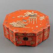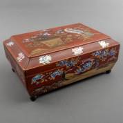 Rode Japans lakwerk naaikist met parelmoer ingelegd, 19e eeuw -gebruikssporen-, 15,5 × 36 × 25,5 cm