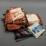 Twee katoenen ikats met diermotieven, Sumba, -beide vermaakt tot gordijnen-, diverse batik doeken, Java, Indonesië, 20e eeuw -enkele doeken verknipt-, diverse afmetingen, Chinese zijde op zijde geborduurd deel van een mantel en mouwband, en zijde doek met opdruk met landschapsdecor, diverse afmetingen