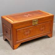 Grote Chinese padoek kist, de panelen met gesneden gelukstekens, 20e eeuw -randen verkleurd, slot bijgevoegd-, 54 × 101 × 53 cm