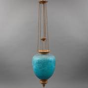 Hallantaarn met kaarsenhouder en blauw glazen kap voorzien van reliëfdecor van feniks in cartouche, met vergulde monturen, 20e eeuw -gebruikssporen, enkele kleine defecten aan monturen-, 40× Ø 25 cm