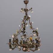 Metalen twaalflichts kroonluchter met porseleinen bloemetjes -gebruikssporen-, hoogte met ophanging circa 100 cm, Ø circa 70 cm