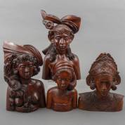 Vier gesneden houten beelden: paar bustes van echtpaar, een van één Balinese vrouw, en één van een man, alle Bali, tweede helft 20e eeuw, grootste hoogte 35 cm -man van echtpaar mist krisheft-