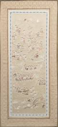 Chinees zijde op zijde geborduurd kleed in lijst, met decor van spelende en roeiende kinderen in en om het water, 20e eeuw, 65,5 × 33,5 cm -opbrengst ten bate van het Rijksmuseum Amsterdam-