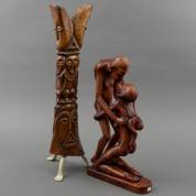 Gesneden houten beeld: kussend koppel, en gesneden been: gezichten, 46 en 62 cm hoog