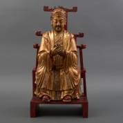Roodgelakt huisaltaar waarop verguld houten taoïstische god, midden 20e eeuw -slijtage, vingers van rechterhand gebroken-, 60 × 31 × 21,5 cm