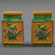 Paar Chinees porseleinen sancai rechthoekige vazen met vruchtendecor, Qianlong gemerkt, 20e eeuw, 13 × 8 × 4,5 cm