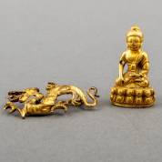 Verguld metalen applique in de vorm van een draak, vermaakt tot broche, 3 × 4,5 cm, en verguld metalen Boeddhabeeldje met oogje in de arm, 4 cm