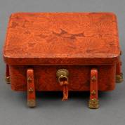 Japans rood lakwerk dekseldoosje met bloemdecor en staande op zes pootjes -één pootje mist messing voetje en een pootje mist twee ornamentjes-, 6,5 × 13 × 10,5 cm