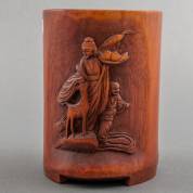 Chinese bamboe penselenbeker met reliëfdecor van twee onsterfelijken met hert en inscriptie, 20e eeuw, 14,5 × Ø 10 cm