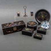 Japans lakwerk handschoenendoos met parelmoer inlegwerk, blikken koekdoos op onderschotel, twee glazen zoutvaatjes in verzilverde houder, verzilverde strooier en mosterdpot met lepel -deksel ontbreekt-, drie in elkaar passende Japans lakwerk doosjes, en Chinees porseleinen schoteltje met blauw-wit bloemdecor, 17e/18e eeuw -gebruikssporen-, handschoenendoos: 26 × 10 × 8 cm