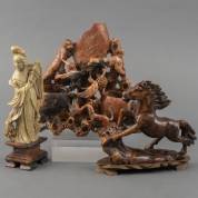 Drie speksteen snijwerkjes: aapjes op rots, galopperend paard, en Guanyin, alle China, 20e eeuw, aapjes 19,5 cm hoog