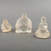 Twee bergkristallen Budai's en een Boeddha, 9 cm hoog