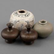 Vier diverse Aziatische vaasjes: twee brons -deukjes-, één celadon, de ander aardewerk, grootste vaasje 7,5 × 8 cm
