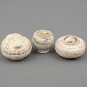 Drie witte steengoed Sawankhalok dekselpotjes, 14e-16e eeuw -slijtage, decors vervaagd-, grootste 3 × Ø 6 cm