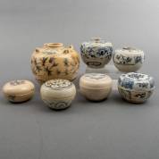 Zeven steengoed potjes en dekseldoosjes met blauw-witte decors, Zuidoost-Azië, hoogste 11 cm
