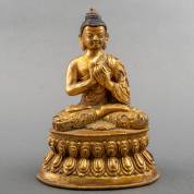 Verguld bronzen beeld: Shakyamuni Boeddha zittend op dubbele lotustroon, met blauwgeverfd haar, Sino-Tibetaans, 20e eeuw, hoogte 15 cm