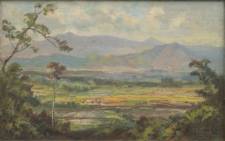 Satria Djuprijany (1929), Indonesisch landschap met rijstvelden, marouflé, r.o. gesigneerd, 35 × 56 cm