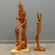 Twee gesneden houten beelden: Balinese vrouwen, één op natuurstenen basement, beide modern -grootste beeld met gelijmde kroon-, grootste hoogte 81 cm