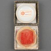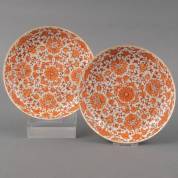 Paar Chinees porseleinen diepe borden met melk-en-bloed bloem- en vleermuizendecor, circa 1900 -één randbeschadiging-, Ø 23,5 cm