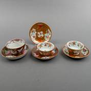 Drie Chinees porseleinen capucijner kommetjes en vier schoteltjes met verschillende polychrome decors, 18e eeuw -defecten-, 5 × Ø 12 cm