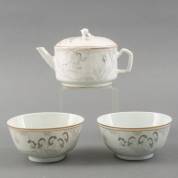 Chinees porseleinen theepot en twee kommen met grijs figurendecor, de kommen met zegelmerk, 20e eeuw -tuit theepot met klein chipje-, hoogte theepot 10 cm