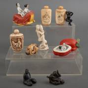 Diverse kleine erotische beeldjes en snuifflesjes van hout, been en porselein
