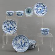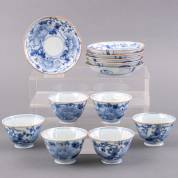 Diverse Chinees porseleinen kommetjes en schoteltjes met blauw-wit decor, bestaande uit: set van één kommetje en zes schotels met lange lijzendecor, en drie kommetjes en twee schotels met zotjesdecor, alle 18e eeuw, grootste schoteltje Ø 11,2 cm