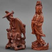 Twee Chinese houten beeldjes: Guanyin die op een draak staat, en zittende oude man met hoed, hoogte Guanyin 19 cm