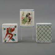 Drie Chinees porseleinen hoofdkussens met decors: pareljagende draak, bloemen en vogels, en geometrisch patroon, 20e eeuw, 14 × 11 × 6,5 cm