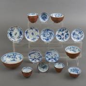 Veertien diverse Chinees porseleinen capucijner kommetjes zeven schoteltjes, alle met blauw-wit decor, 18e eeuw -defecten-, grootste kom 7 × Ø 14,8 cm