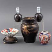 Japanse tinnen thee- of tabakspot, de buitenkant met bloem- en goudvisdecor -deuk-, Japans porseleinen Imari vaasje, paar Japans porseleinen sakeflesjes, en Japans porseleinen Imari schoteltje gemonteerd op houten standaard met 2e gehalte zilveren montuur -kleine defecten-, hoogte pot 18 cm