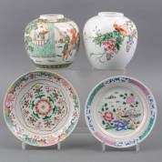 Chinees porseleinen famille verte gemberpot met decor van reisgezelschap, 19e eeuw, Chinees porseleinen gemberpot met decor van vogel in wisteriatak, modern, Chinees porseleinen schotel met famille rose bloemdecor, 18e/19e eeuw en Chinees porseleinen bord met famille rose tuindecor met vogel, 19e eeuw -defecten-, schotel Ø 22 cm