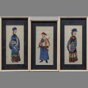 Drie schilderingen op rijstpapier: tweemaal een vrouw, en eenmaal een man, China, circa 1900, 18 × 8 cm