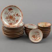 Acht Chinees porseleinen capucijner kommetjes en tien schoteltjes, alle met melk-en-bloed bloemdecor, 18e eeuw -één kommetje gerestaureerd, defecten-, schotels Ø 11,9 cm