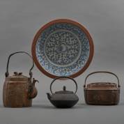 Chinees bronzen handwarmer, Japanse gietijzeren tetsubin, koperen oosterse theepot en een Chinees porseleinen capucijner bassin, bassin 8,5 × Ø 28,5 cm