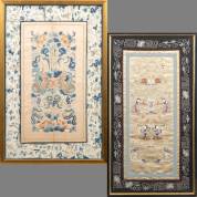 Paar Chinese zijde op zijde geborduurde mouwstukken met vleermuisdecor, het passe-partout geborduurd met zotjes, begin 20e eeuw, en zijde op zijde geborduurd tafellopertje met voorstelling van figuren in tuin, beide in lijst, 20e eeuw -grootste met lijst 69 × 45 cm