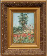 Aquarel: rode bloemen bij palmboom, niet gesigneerd, 17 × 12 cm