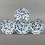 Vier Chinees porseleinen borden met blauw-wit floraal decor, 19e eeuw -randdefecten, bakfoutjes, één gelijmd-, Ø 22,5 cm