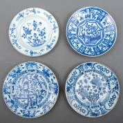 Vier Chinees porseleinen borden met blauw-wit tuindecor, waarvan één in Wanli-stijl, Qianlong, 18e eeuw -defecten-, Ø 22,5 cm -opbrengst ten bate van het Rijksmuseum Amsterdam-